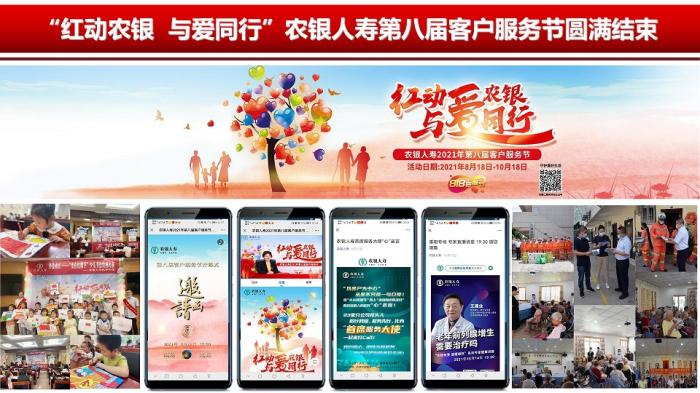 近日,以“红动农银 与爱同行”为主题的农银人寿第八届客户服务节圆满落下帷幕。历时两个多月的活动,围绕“与爱同行”“伴爱成长”“用爱记录”“以爱护航”“如爱随行”“为爱守护”六大模块推出系列精彩内容,为广大客户带来集知识性、互动性、趣味性为一体的丰富服务新体验。活动覆盖老中青不同圈层客群,同时兼顾高净值客户,通过线上线下互联互通,全面传递红色动能与健康理念。活动效果显著,获得了广泛好评,用实际行动践行了“农情服务,天天进步”的宗旨,为进一步树立公司服务品牌助力添彩,献礼建党百年。