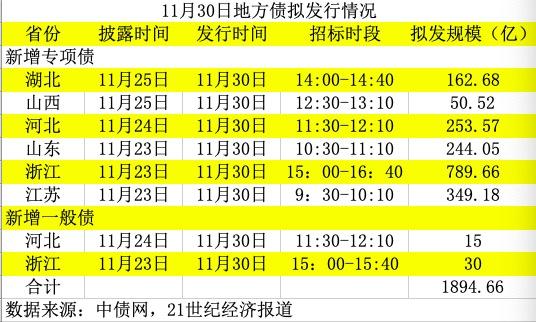 据记者统计,11月30日共有六个省份发行专项债,招标时间从上午持续到下午,全天发债规模接近2000亿。