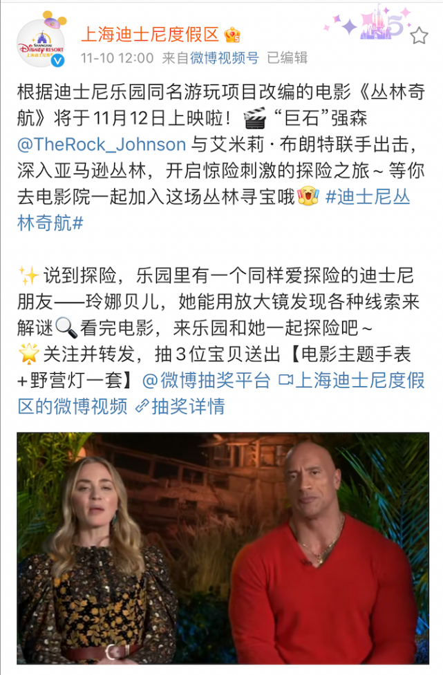 当然,官方蹭流量也不是第一次了,在此之前,「儿儿」还为《丛林奇航》“站台宣传”引流,宣传的还是巨石强森的电影。