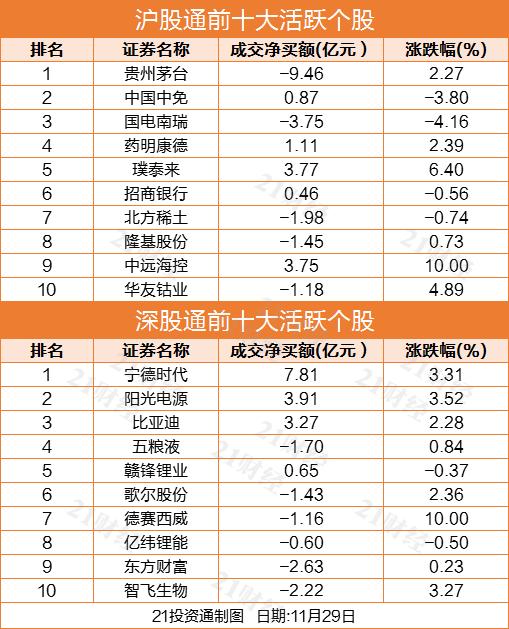 北向资金十大活跃个股方面,宁德时代(300750.SZ)、阳光电源(300274.SZ)、璞泰来(603659.SH)分别获净买入7.81亿元、3.91亿元、3.77亿元。