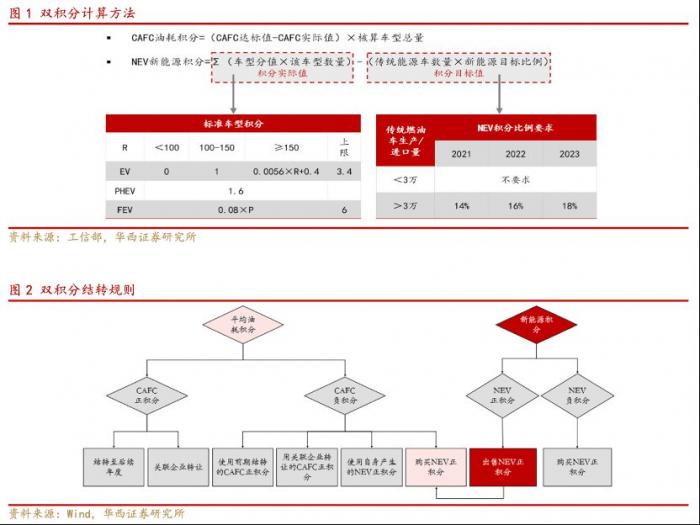 所谓的“双积分”为:CAFC(Corporate AverageFuel Consumption,企业平均燃油消耗量)积分和NEV(New Energy Vehicle,新能源车)积分,一般业内将这二者简称为“油耗积分”和“新能源积分”。