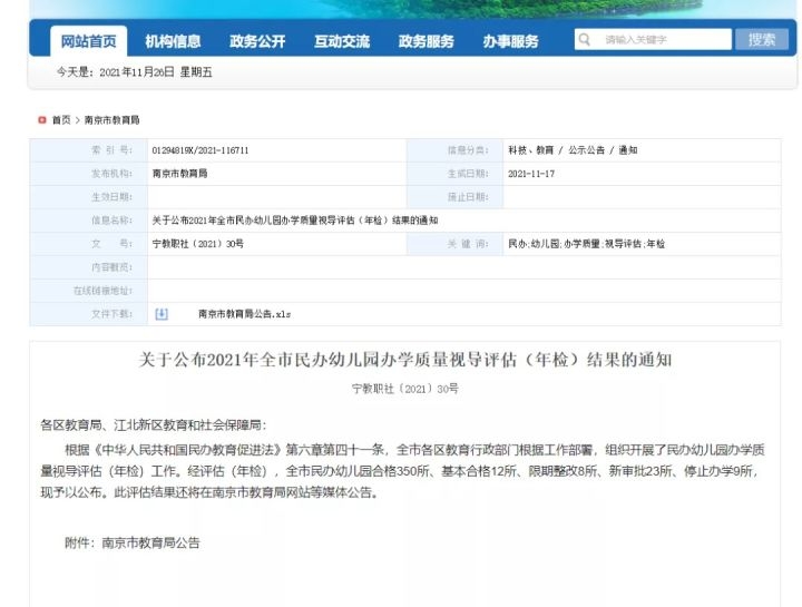 南京市教育局发布《关于公布 2021 年全市民办幼儿园办学质量视导评估(年检)结果的通知》,全市民办幼儿园合格 350 所,基本合格 12 所,限期整改 8 所,新审批 23 所,停止办学 9 所。