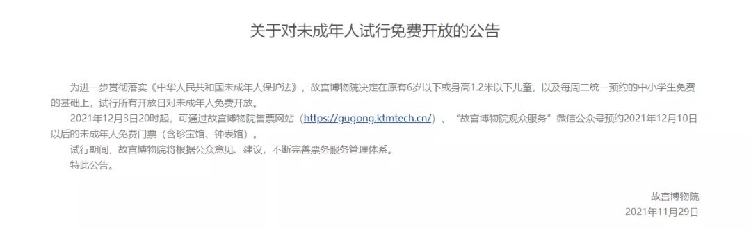 故宫博物院决定:在原有 6 岁以下或身高 1.2 米以下儿童,以及每周二统一预约的中小学生免费的基础上,试行所有开放日对未成年人免费开放。12 月 3 日 20 时起,可通过故宫博物院售票网站、微信公众号预约 10 日以后的未成年人免费门票。