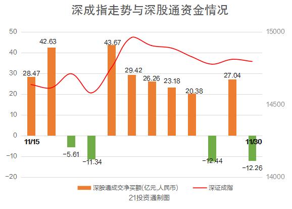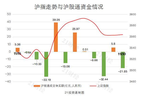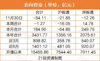 北向资金方面,11月30日沪股通和深股通分别净卖出21.85亿元和12.26亿元,合计净卖出34.11亿元。11月份,北向资金累计净买入185亿元,延续了今年以来每个月净流入的态势。