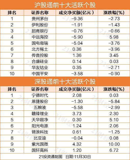 北向资金十大活跃股方面,11月30日贵州茅台(600519.SH)、中远海控(601919.SH)、五粮液(000858.SZ)分别被净卖出9.36亿元、5.9亿元、5.58亿元。紫光国微(002049.SZ)获净买入额居首,金额为4.32亿元。宁德时代(300750.SZ)连续第4天获净买入,当月累计被北向资金净买入115亿元。