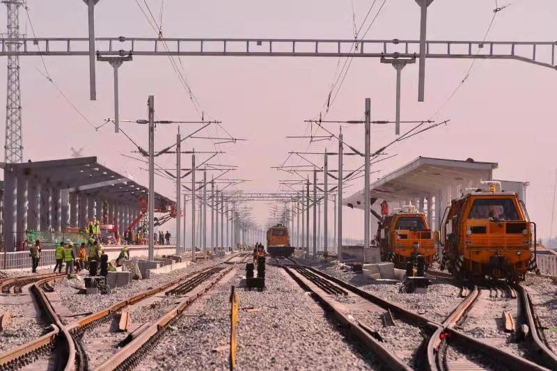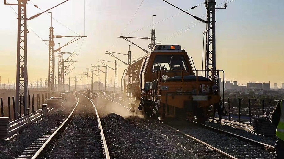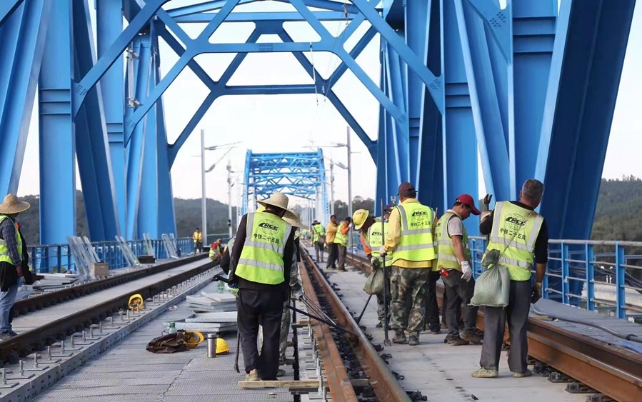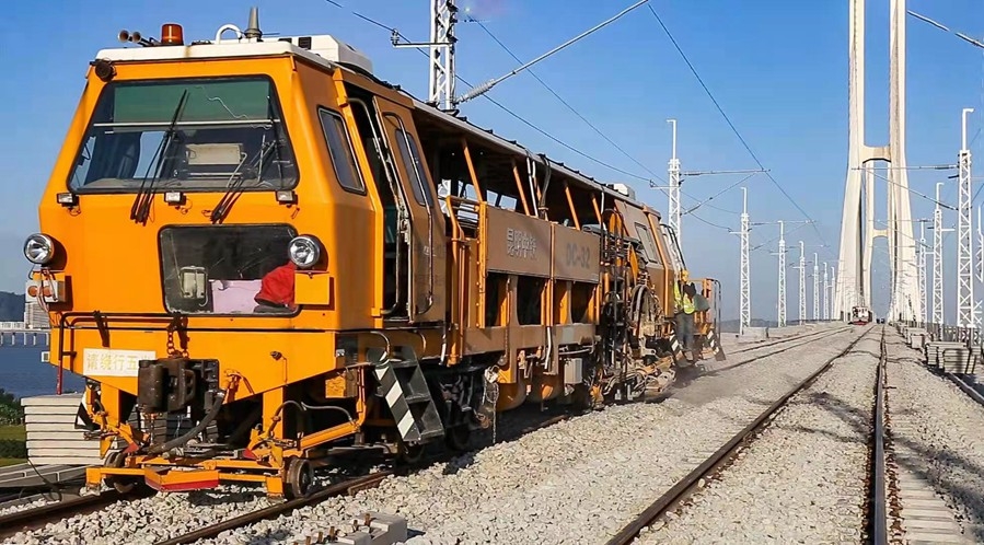 据介绍,为安全高效推进正线铺轨施工,施工方中铁二十五局克服长轨推送作业进场运输困难、交叉作业多等不利因素,以精细化管理和标准化建设为抓手,强化施工资源配置,全线共投入5台机车、17台轨道车、4台大型捣固机、2台焊机、130辆风动车,每日上道砟近万立方,组织施工人员三班轮换作业、昼夜奋战,最终顺利实现了正线铺轨节点目标。