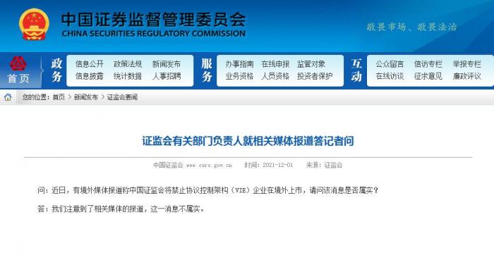 禁止协议控制架构企业在境外上市?证监会辟谣:不属实