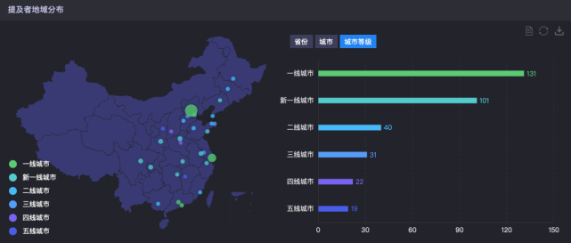 根据提及者的地域分布,可以看到一线及新一线城市的提及者,相比其他城市的提及者要高出很多。