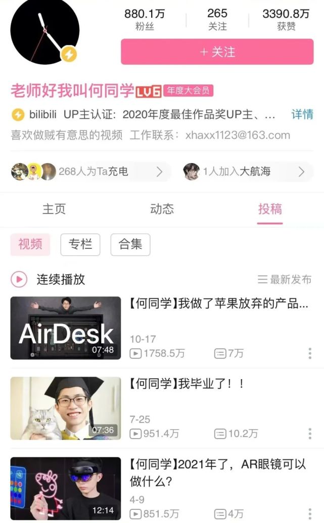 最后,张同学的走红也让时有趣联想到了同为拍摄技巧高超的何同学。何同学平台账号叫“老师好我叫何同学”,因为高质量的视频和独特的视角备受关注,最高光的一刻是与苹果CEO库克进行专访对话。