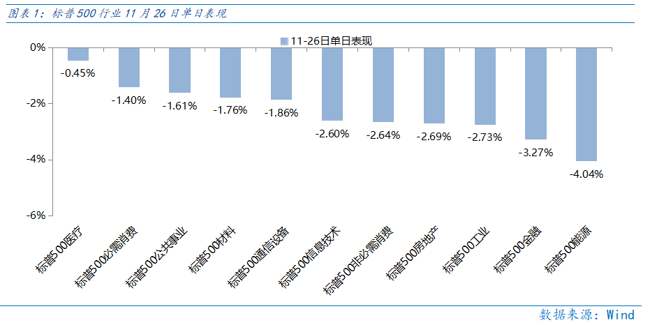 由于变异毒株奥密克戎极强的传播力,其引发全球市场巨幅波动。而在全球股市大跌的背景下,医药行业表现强势,上周五美股的道指、纳指分别跌2.53%和2.23%,而标普500医疗仅下跌0.45%,超额收益明显。