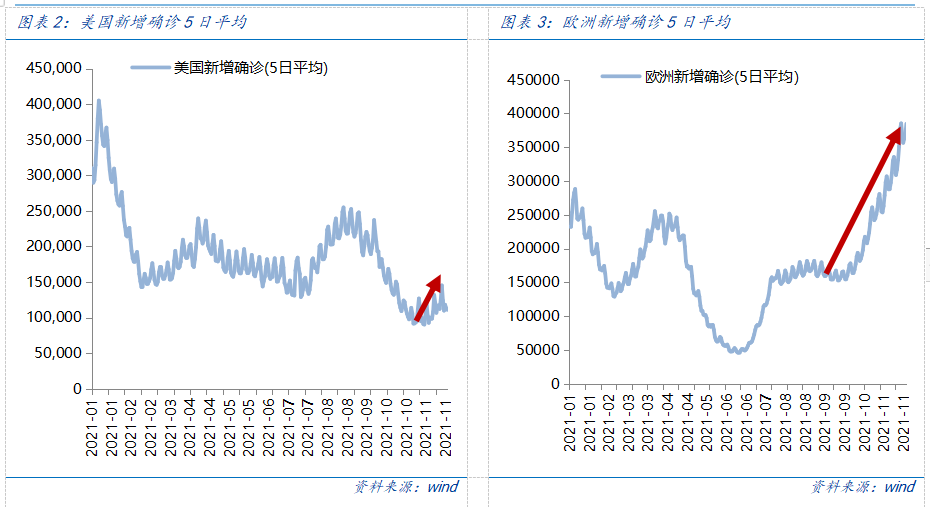 欧美“疫苗+特效药+开放”的抗疫模式在毒株奥密克戎传播以前已经有一定“瑕疵”,毒株奥密克戎则提高了冬季新一轮疫情到来的置信度,无论有无变异毒株,市场交易“疫情重启”或是确定的。欧美新增确诊人数已经在拐头向上,特别是欧洲的新增确认(5日平均)已经从低位5万人上升至40万人左右,新一轮疫情已经在酝酿。