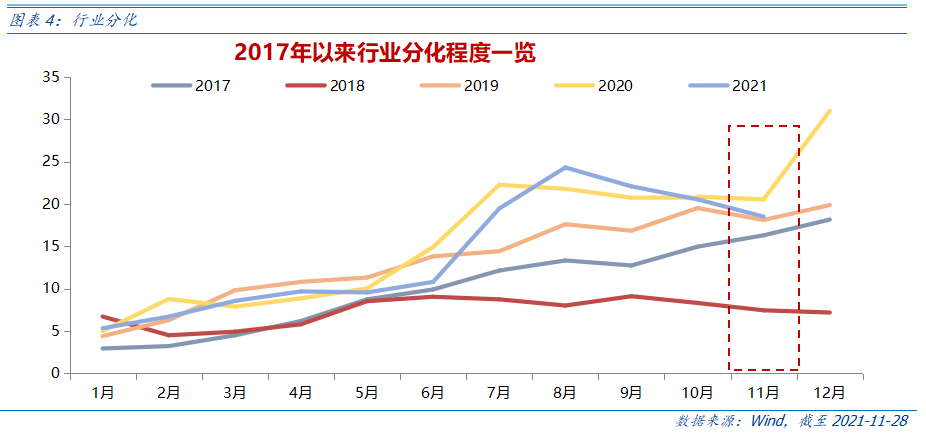 行情节奏而言,A股往往在四季度中会分化“收敛”,即弱势行业的估值修复,之后临近年底又分化“扩大”,即前期强势行业的行情重启。当前我们处于四季度的中后段,A股自8月后连续3个月分化“收敛”,短期分化“收敛”即“均值回归”的板块会有一定机会。