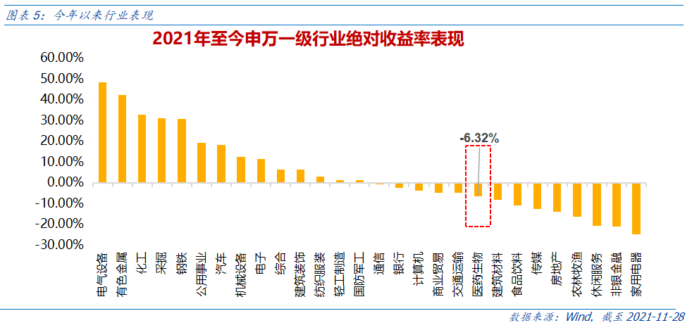 “均值回归”对应“高胜率”,当前医药行业的投资胜率已经较高。今年医药行业表现较差,对应投资“胜率高”。医药跑输大盘,绝对收益率为-6.32%,处于申万一级行业的倒数第9位,后市或有修复机会。