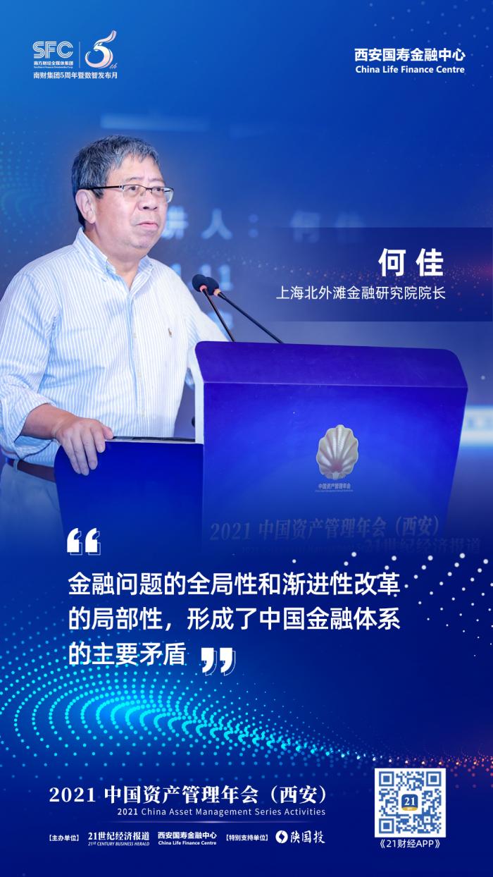 11月25日,由21世纪经济报道、西安国寿金融中心主办,陕西省国际信托股份有限公司特别支持的“新动力 新价值 新共识”—2021中国资产管理年会(西安)顺利举行,清华大学、浙江大学双聘教授、上海北外滩金融研究院院长何佳在年会上发表了“中国金融体系的主要矛盾与稳定发展”的主题演讲。