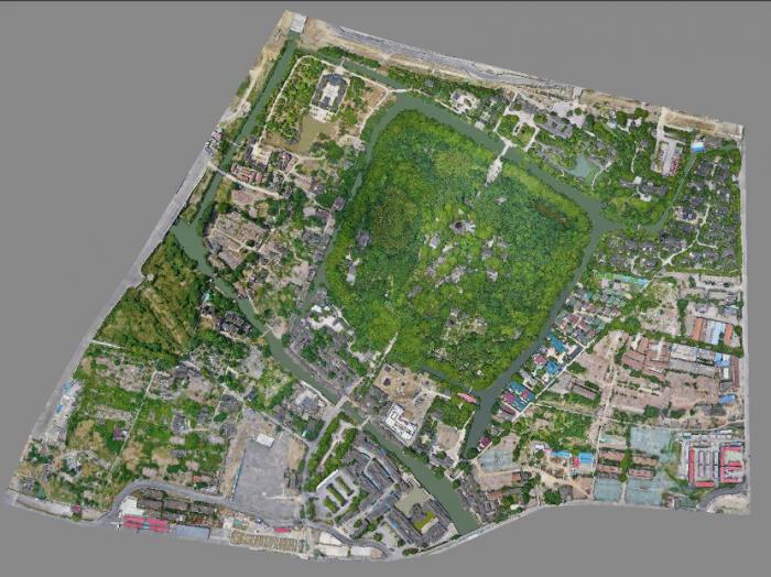 虎丘塔影园内植被丰富,建筑和林木相融相衬,也为测绘增加了难度。针对植被遮挡严重(如头门山)与高差大(虎丘塔)的景点,项目组出动无人机用低空绕飞的倾斜数据与整体倾斜多次融合完成高精模型。