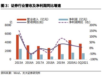 证券行业业绩持续向好。根据中国证券业协会行业数据,2021年前三季度140家证券公司总资产10.3万亿元,实现营业收入3663.6亿元,同比增长7%;实现净利润1439.79亿元,同比增长8.51%。前三季度共有124家证券公司实现盈利,占比89%。