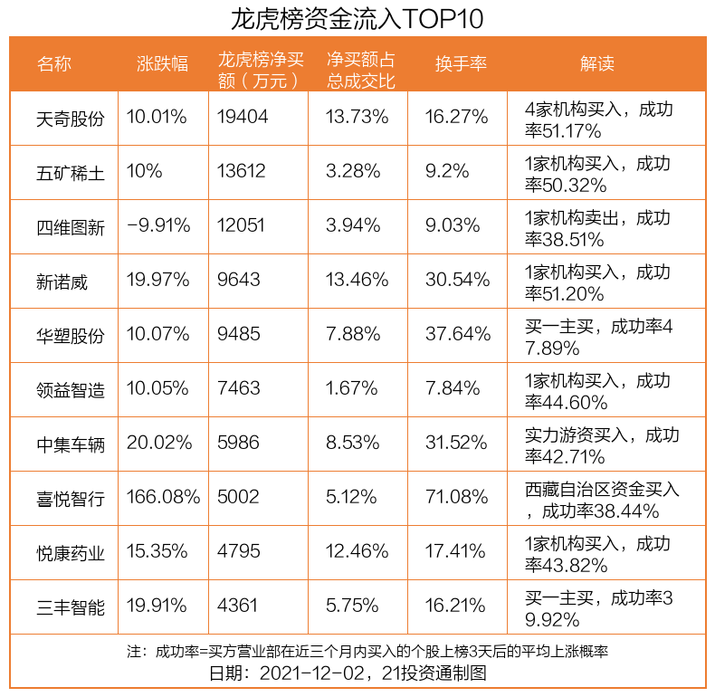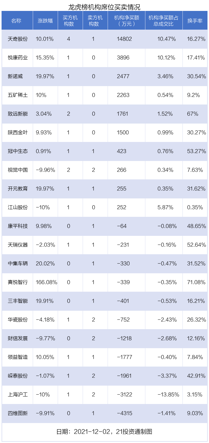 12月2日,21只个股龙虎榜出现了机构的身影,机构合计净买入1.34亿元。具体来看,机构净买入10股,净卖出11股。