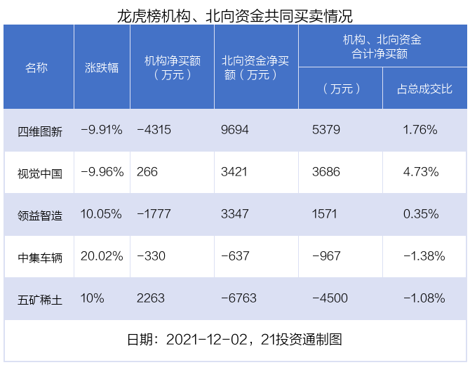 值得注意的是,机构和北向资金共同净买入了视觉中国等1股;共同净卖出了中集车辆;在四维图新,领益智造,五矿稀土上出现分歧,机构净卖出四维图新4315.44万元,北向资金净买入9694.44万元;机构净卖出领益智造1776.82万元,北向资金净买入3347.43万元;机构净买入五矿稀土2263.22万元,北向资金净卖出6763.11万元。