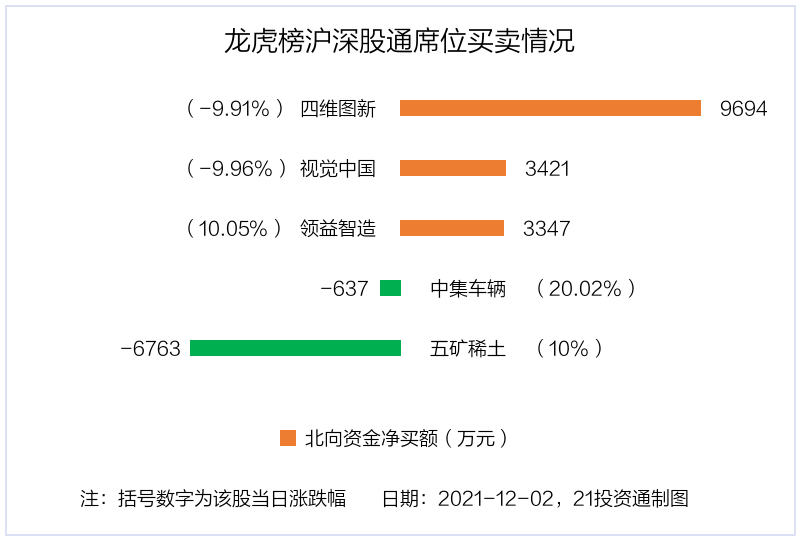 12月2日,北向资金参与龙虎榜中的个股共有5只,其中深股通净买入3 股,净卖出2 股,合计净买入9062.57万元。