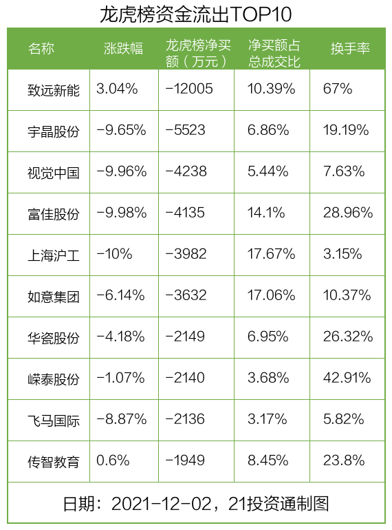 而龙虎榜中资金净流出最多的是致远新能(300985.SZ),被净卖出为1.2亿元,占总成交金额的10.39%。致远新能收盘上涨3.04%,换手率为67%。