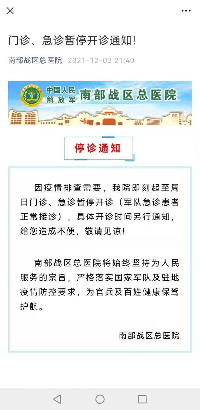 12月3日,南部战区总医院对外发布通知,因疫情排查需要,即刻起至周日门诊、急诊暂停开诊(军队急诊患者正常接诊),具体开诊时间另行通知。
