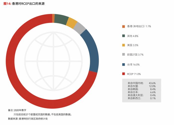 报告中数据指出,2020年,香港出口往RCEP成员的 商品价值达3596亿美元,占香港出口总额的71%,而其75%的进口(价值4081亿美元)来自RCEP成员国。事实上,香港对RCEP的出口大多为转口贸易(2020年占出口总额的 98.9%),其出口的商品也主要来自RCEP成员国。具体来看,香港出口的商品主要来自中国内地和东盟两大来源地,分别占香港2020年对 RCEP 出口的43.6% 和 12.0%。未来,香港以其广阔的商贸关系网络、完善的交通基础设施和高效的物流服务必将发挥更大作用。尤其在内地企业走出去过程中所需的:投资规划、地址选择和尽职调查,金融服务,法律、财会及其他专业服务,物色和筛选本地合作伙伴等方面,香港具备独特优势。