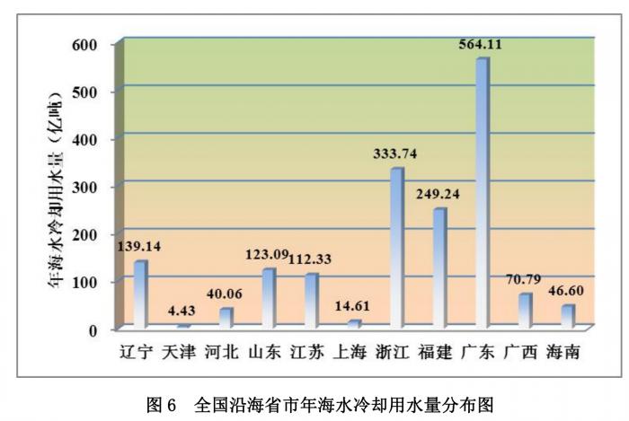 海水冷却工程分布在辽宁、天津、河北、山东、江苏、上海、浙江、福建、广东、广西、海南 11 个沿海省市,其中广东2020年海水冷却用水量最多,达564.11亿吨,约占2020年全国冷却用水量的33.22%。