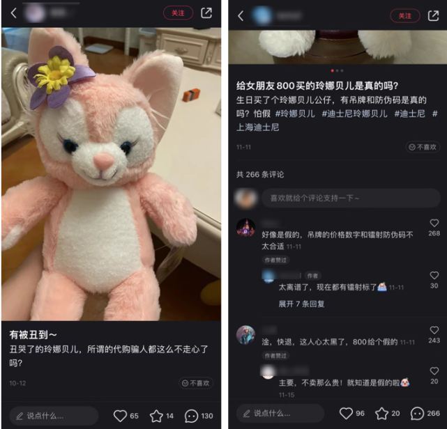 有小红书网友晒出自己的“血泪教训”,花了 400 多元买到和正品天差地别的假货;还有网友表示,假货制造商的技术越来越高超,能让人一眼难辨真假,网络上有花了 800 多元买到了一个“高仿”公仔。