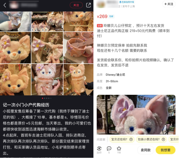 有一位代购在小红书上分享了玲娜贝儿公仔发售后的购买经历,只以原价+ 5 元代购费的价格售出;一位闲鱼的代购也以原价+ 50 元代购费接受玲娜贝儿公仔的预定。