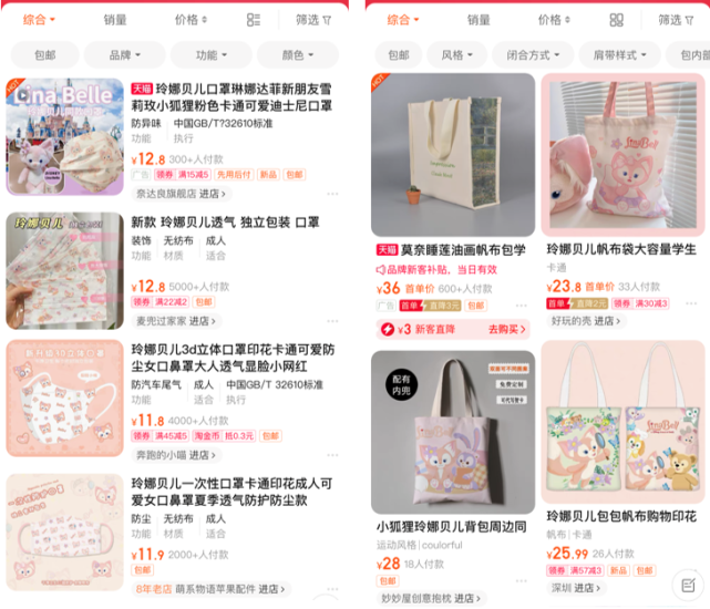许多中小商家制作了带有玲娜贝儿元素的口罩、帆布包、 U 型枕、发箍、手机壳等产品,在店里都属于是热门款。