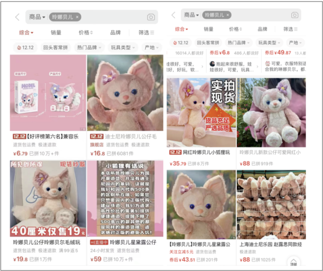 因此,在这样的消费需求下,网上“打版”玲娜贝儿周边、以低价出售的卖家也是不计其数。