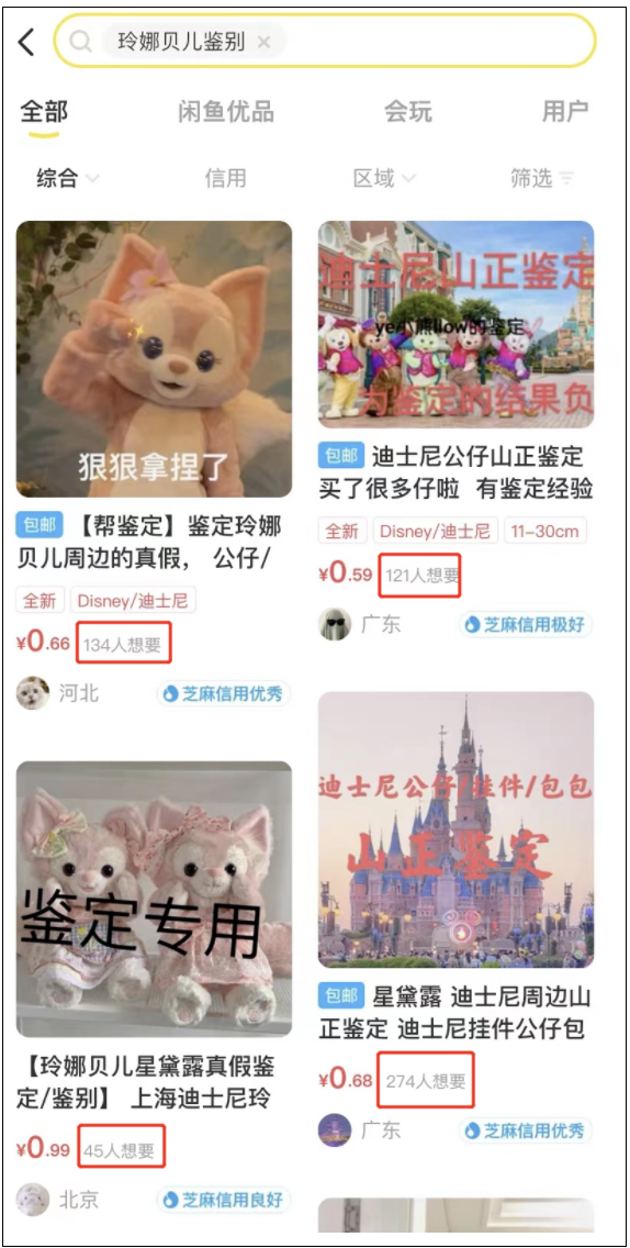 在小红书上,“鉴别玲娜贝儿真假”的相关笔记有 6 万多篇。在闲鱼上,甚至还催生出了“商品真假鉴别”的生意,从“想要”的数量来看,这项服务也受到不少人的欢迎。