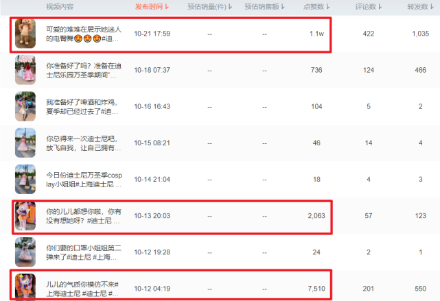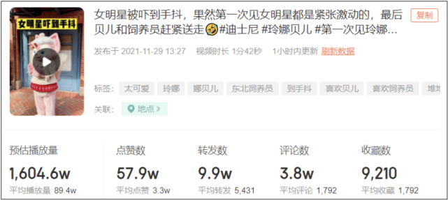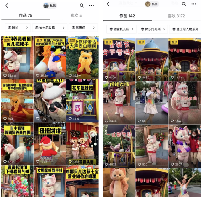 @迪士尼老玩家 也有做迪士尼其他人物的跟拍,但有玲娜贝儿出镜的视频,其点赞量通常是其他视频的数十倍。