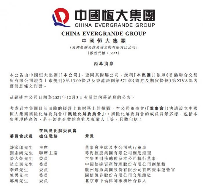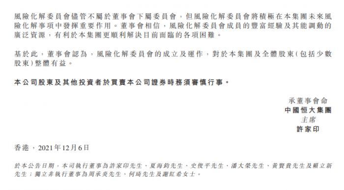 12月6日晚间,恒大公告称,考虑到本集团目前面临的经营上和财务上的挑战,本公司董事会决议设立中国恒大集团风险化解委员会。风险化解委员会的成员背景多样,包括本集团现时高管、若干领先企业的高管及专业人士等,具体包括:许家印、刘志鸿、潘大荣、赵立民、李锋、陈勇、郝瀚。