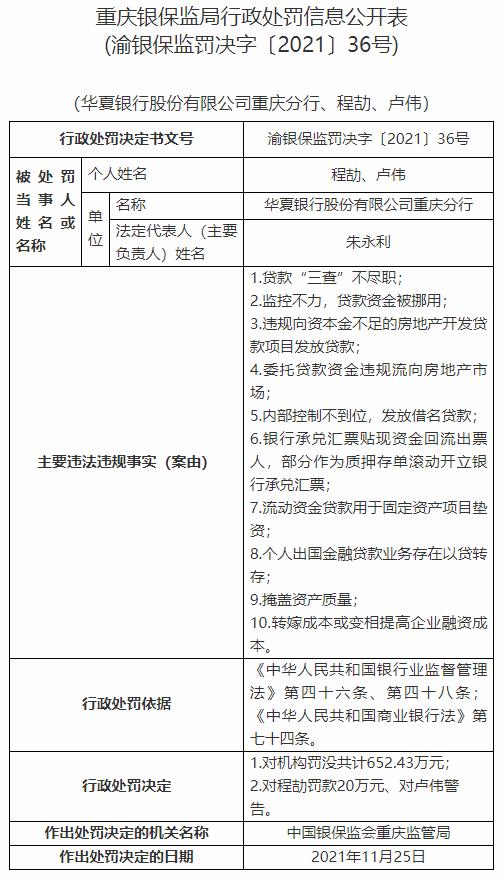 因贷款资金被挪用、违规向资本金不足的房地产开发贷款项目发放贷款等10项违法违规,华夏银行重庆分行近日被银保监会重庆监管局罚没652.43万元,并对当事人程劼罚款20万元、对卢伟处以警告。
