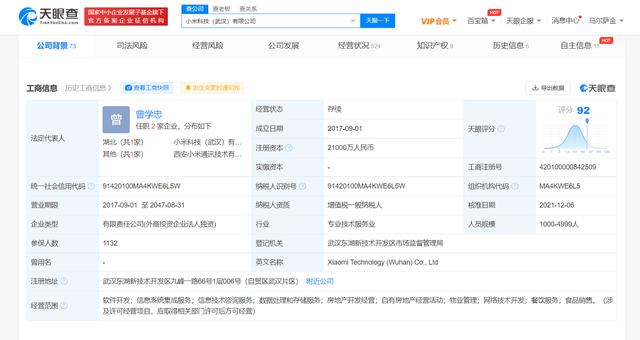 公开资料显示,小米科技(武汉)有限公司成立于2017年9月1日,法定代表人为曾学忠,注册资本为2.1亿元,经营范围包含软件开发;信息系统集成服务;信息技术咨询服务等。该公司由小米通讯技术有限公司全资控股,后者由 XiaomiH.K. Limited全资控股。该公司有6家对外投资企业,包括青年城投资集团有限公司等。