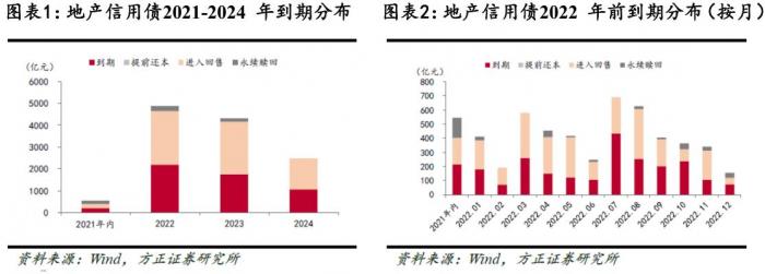 今年年底、明年 1 月和 7 月为房企境内外债券到期最高峰,到期总规模(包括到期、提前还本、回售、永续赎回)在 1500 亿元左右,明年 3 月、4 月、6 月和 8 月为次高峰。