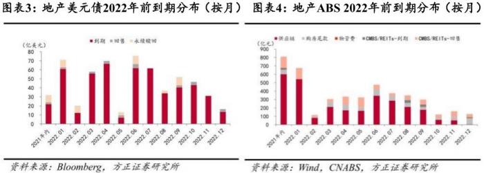 具体房企方面,据方正证券统计,截至 11 月 19 日,样本房企中 2021 年内及 2022 年信用债到期规模超 100 亿元的涉及 11 家,其中部分样本房企到期集中度超60%,到期压力较突出;美元债方面,样本房企中2021年内及2022年美元债到期规模超15亿美元的涉及5家房企;样本房企中 2021 年内及2022 年ABS到期规模超200亿的涉及4家房企。
