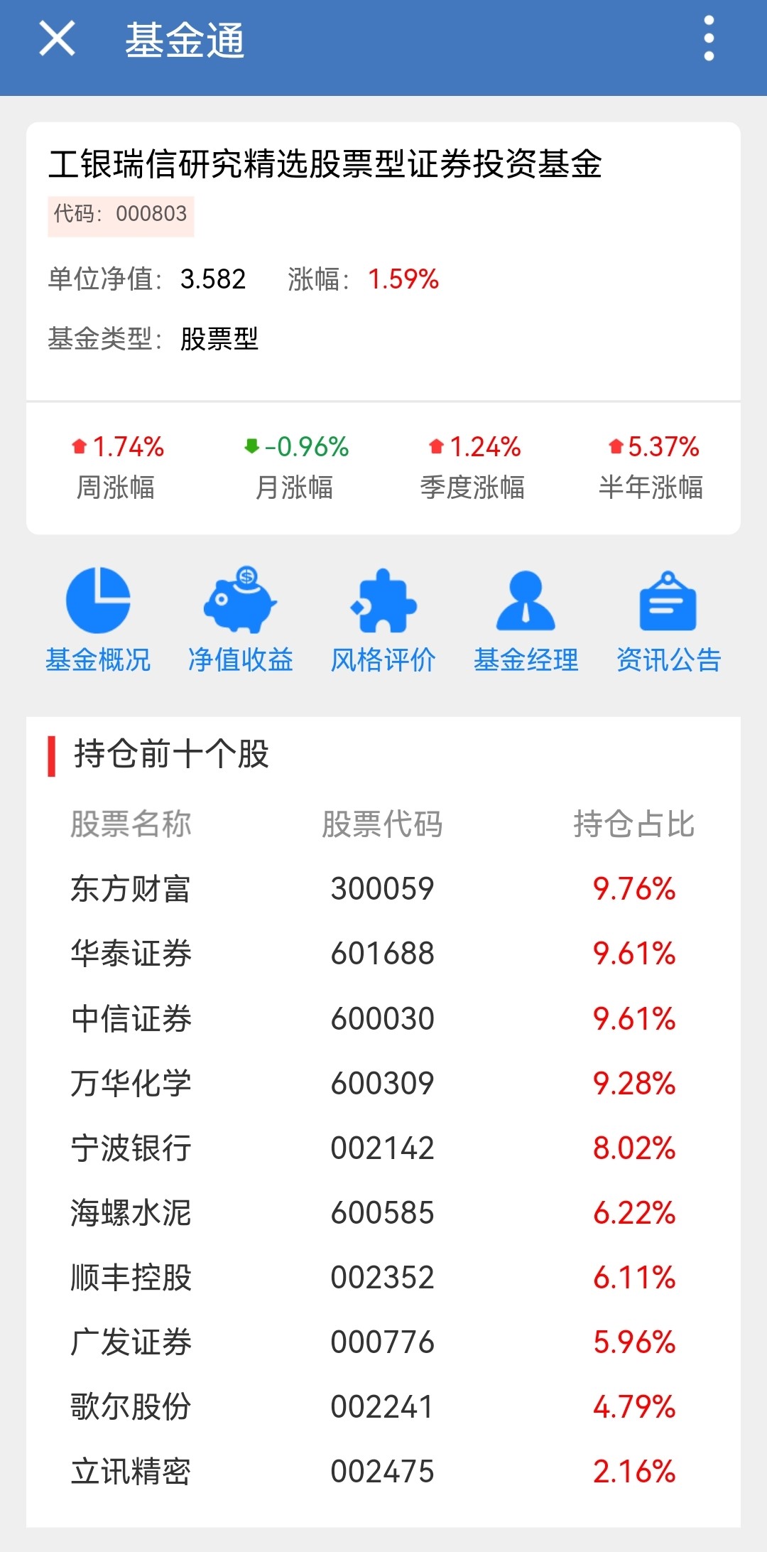 大家都知道,要去看基金重仓了哪些行业,可以看它最新季报披露的十大重仓股。我们举个例子,比如其中的一个涨幅居前的基金——工银瑞信研究精选(000803),它的三季度十大重仓股就如下图所示。