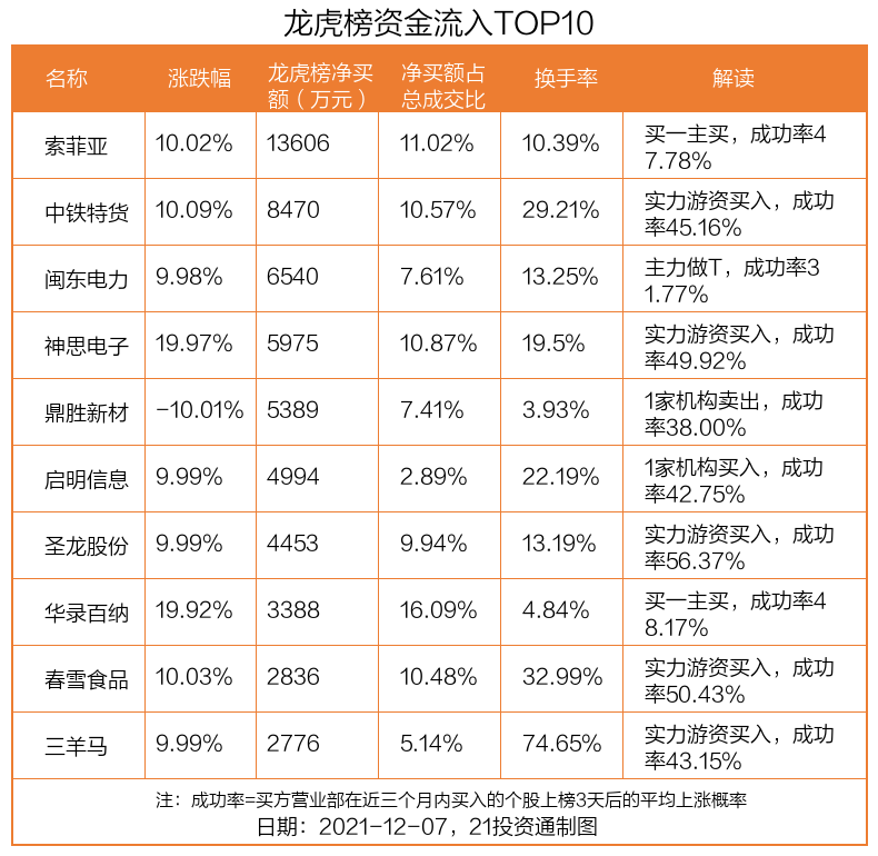 12月7日,上证指数上涨0.16%,深证成指下跌0.38%,创业板指下跌1.09%。盘后龙虎榜数据显示,共有44只个股因当日异动登上龙虎榜,资金净流入最多的是家居板块的索菲亚(002572.SZ),达1.36亿元。