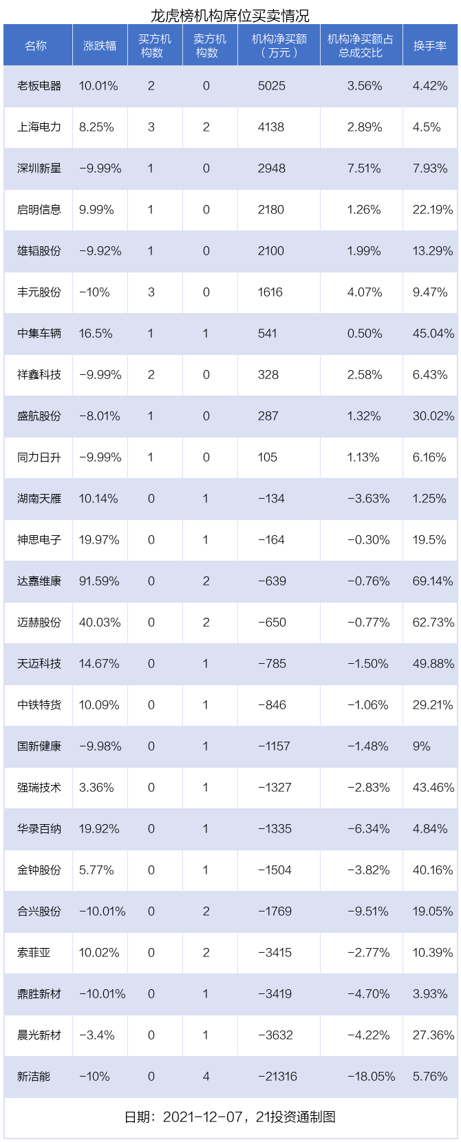 其中,机构净买入金额最多的是老板电器(002508.SZ),当日收盘上涨10.01%,换手率为4.42%。前五大买卖营业部中有2家机构,为合计净买入5025万元,占总成交金额的3.56%。