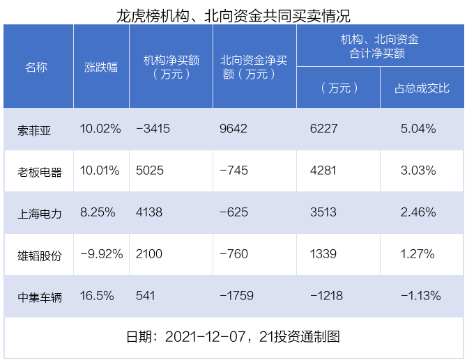 值得注意的是,机构和北向资金在索菲亚、上海电力、老板电器、雄韬股份、中集车辆上出现分歧,机构净卖出索菲亚3415.24万元,北向资金净买入9642.12万元;机构净买入上海电力4138.48万元,北向资金净卖出625.24万元;机构净买入老板电器5025.4万元,北向资金净卖出744.6万元;机构净买入雄韬股份2099.66万元,北向资金净卖出760.2万元;机构净买入中集车辆541.34万元,北向资金净卖出1759.49万元。