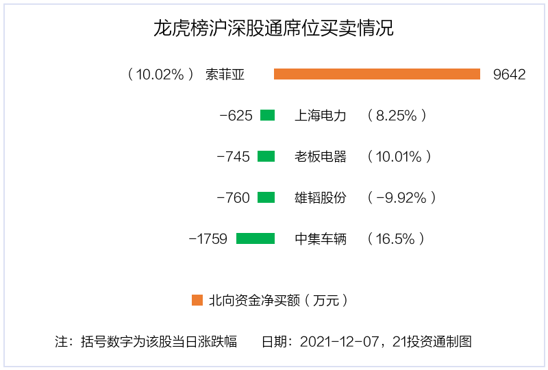 12月7日,北向资金参与龙虎榜中的个股共有5只,合计净买入5752.6万元。其中沪股通净卖出1 股,合计净卖出625.24万元;深股通净买入1 股,净卖出3 股,合计净买入6377.84万元。