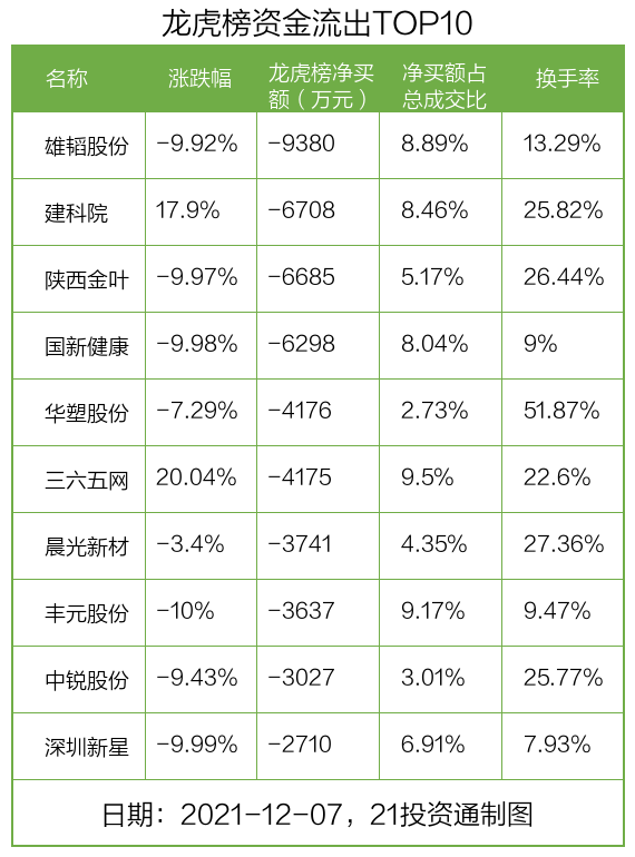 而龙虎榜中资金净流出最多的是雄韬股份(002733.SZ),被净卖出为0.94亿元,占总成交金额的8.89%。雄韬股份收盘下跌9.92%,换手率为13.29%。