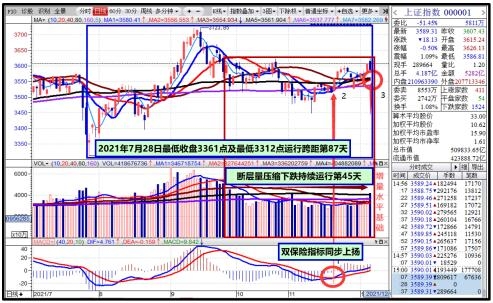 对比周一高开3615点,最高3626点,最后却压低下跌18.13点,收盘3589点。一根带上影线实体黑K线压低下跌,加上周一成交金额5282亿元,成交手数也同步放大,显示多方的涨势结构是明确。从2021年9月28日缩量横向修整跨距达到45天后开始放量上扬,这是明确的增量倾向,即从今天开始之后将进入逐步扩增量的涨势结构。