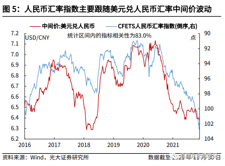 对此,我们以2016年以来的美元兑人民币中间价和CFETS人民币汇率指数,来对前面的逻辑推演进行数据检验。可以看到,2016年以来,两者走势的相关性高达-83%(图中为美元兑人民币中间价与CFETS人民币汇率指数倒序的相关性,因而为83%)。也就说,“811汇改”以来,CFETS人民币汇率指数基本跟随美元兑人民币中间价进行波动。