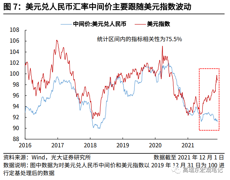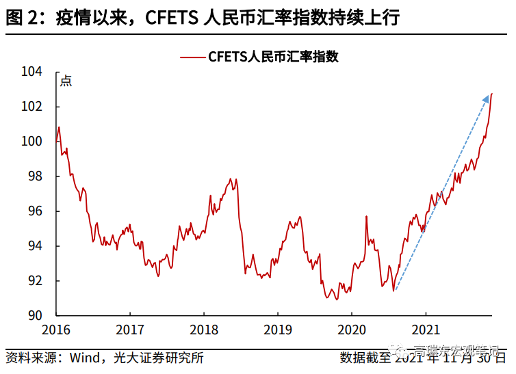 一则,美元持续走弱是人民币持续走强的最主要推手。若我们以外汇交易中心每周公布的CFETS人民币汇率指数,来表征人民币汇率相对主要货币的强弱。根据前面的分析,CFETS人民币汇率指数已经从2020年6月5日的91.69点,一路上行至2021年11月30日的102.76点,历史罕见地突破了100点的重要阻力点位。