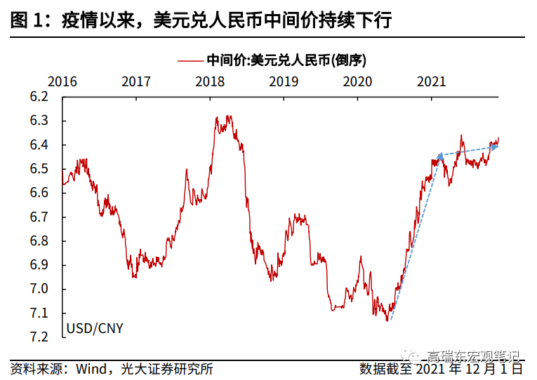 从绝对数值来看,疫情以来,人民币汇率持续上行。可以看到,自2020年年中以来,随着国内疫情逐渐好转,全球疫情持续扩散,人民币汇率持续走强。美元兑人民币中间价由2020年5月29日的7.1316,持续震荡下行至2021年12月1日6.3693,日渐接近“811汇改”后的历史低位。CFETS人民币汇率指数也从2020年6月5日的91.69点,一路上行至2021年11月30日的102.76点,历史罕见地突破了100点的重要防线。