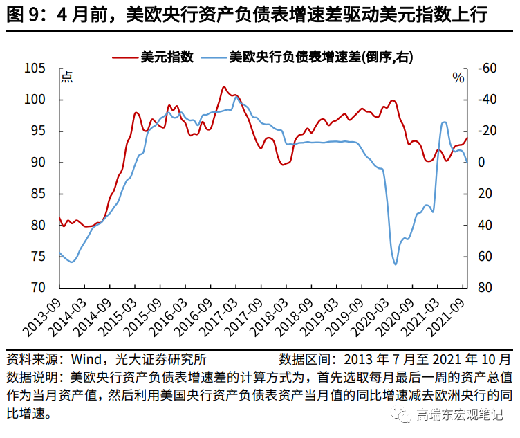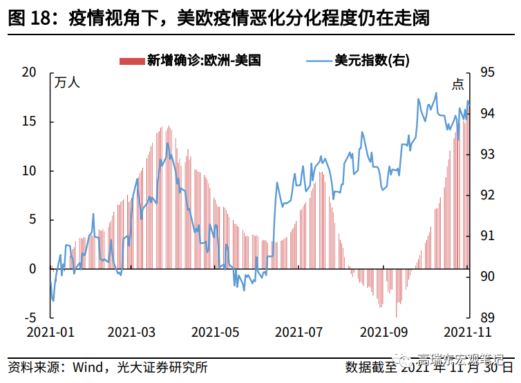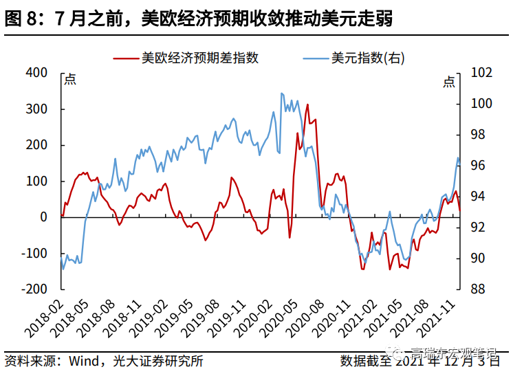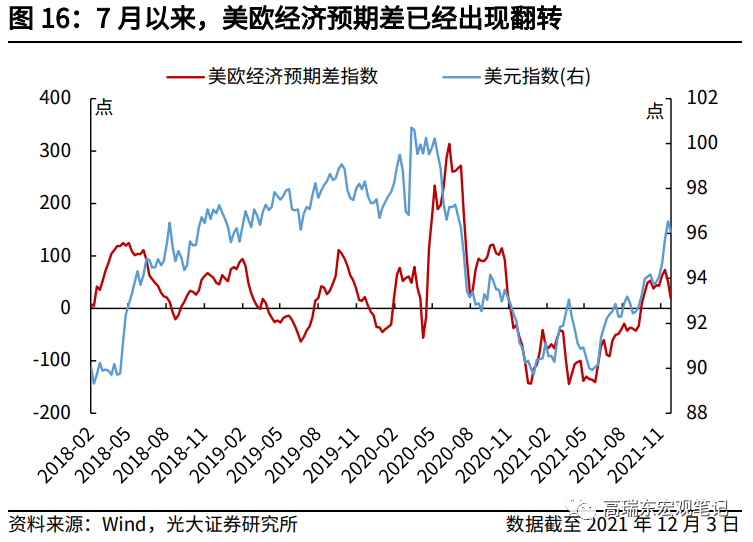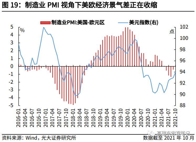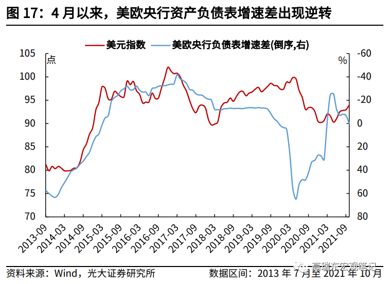 但与此同时,我们也注意到,一方面,美欧制造业景气差,以及市场对美欧经济的预期差,已经开始呈现明显收缩态势。另一方面,随着Taper预期完全纳入美元指数定价,以及美联储加息预期的减弱,货币宽松程度层面对美元指数的利好已基本兑现,后续若欧洲央行开启资产购买缩减,则将对美元指数形成压制。