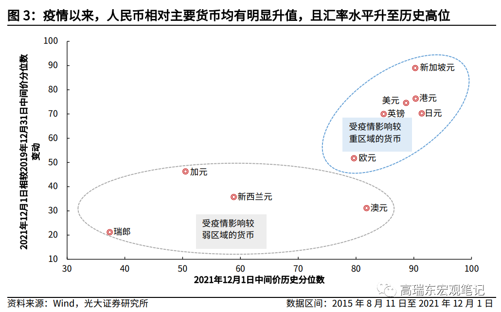 从相对位置看,疫情以来,人民币相对主要货币均有明显升值,且汇率水平升至历史高位。我们以“811汇改”后人民币兑主要货币的中间价为观测集,通过分析当前(2021年12月1日)及其相对疫情前(2019年12月31日),中间价的历史分位数变动,可以发现:目前人民币兑主要发达区域货币的中间价多已接近历史极值状态;并且人民币兑主要发达区域货币的中间价多有大幅上行。